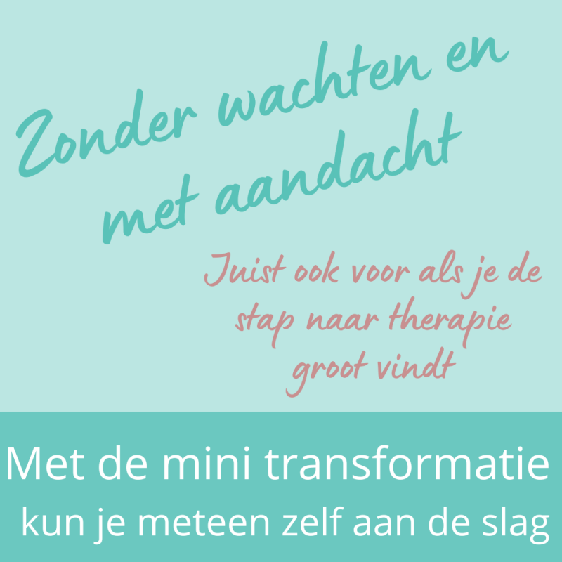 Voor wie niet wil wachten en bij de kers van de taart wil beginnen een juweeltje: de mini transformatie, niet voor diepe trauma’s, wel voor een paar mooie stappen vooruit. Mix van zelf aan de slag en persoonlijke begeleiding.